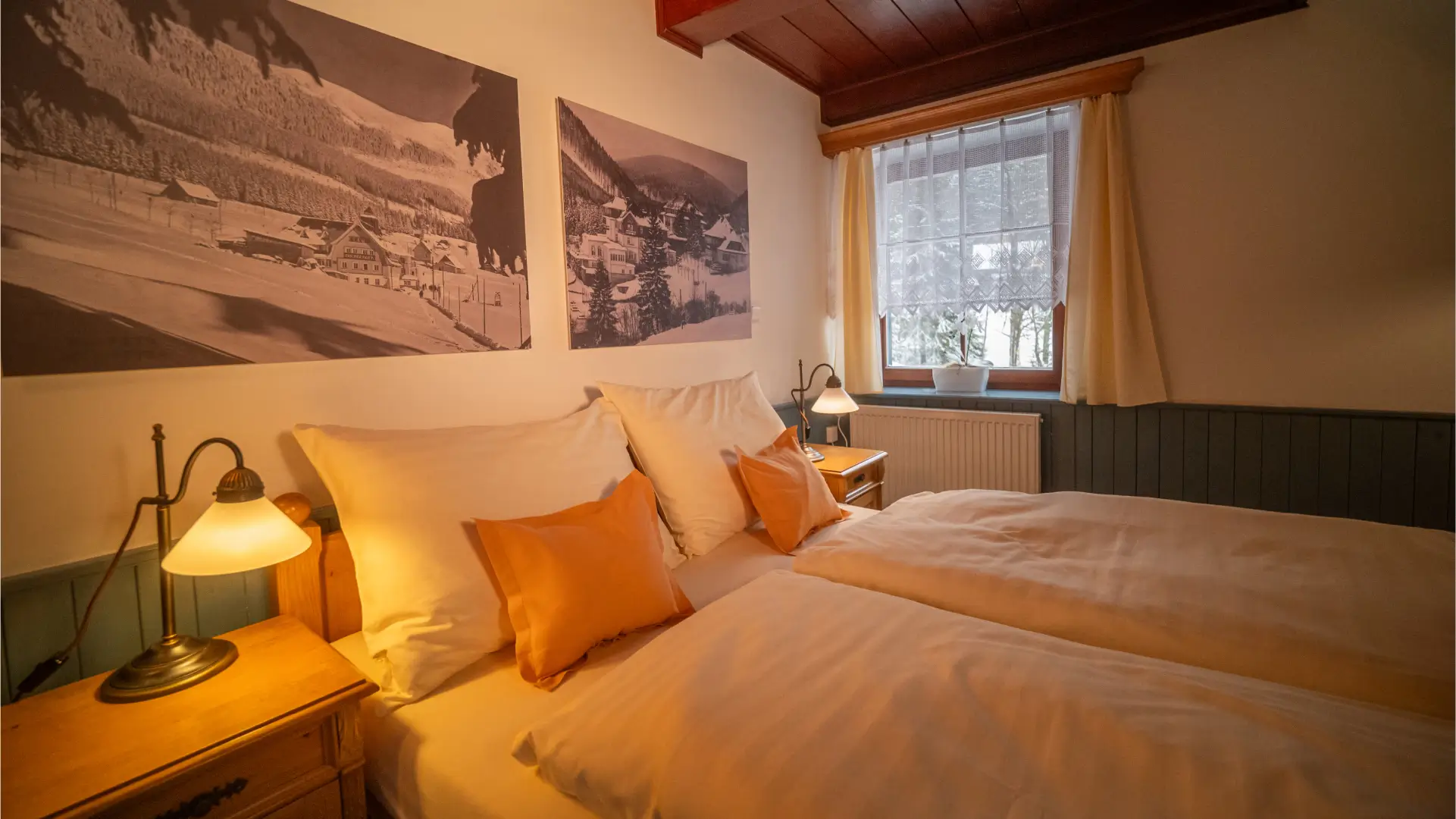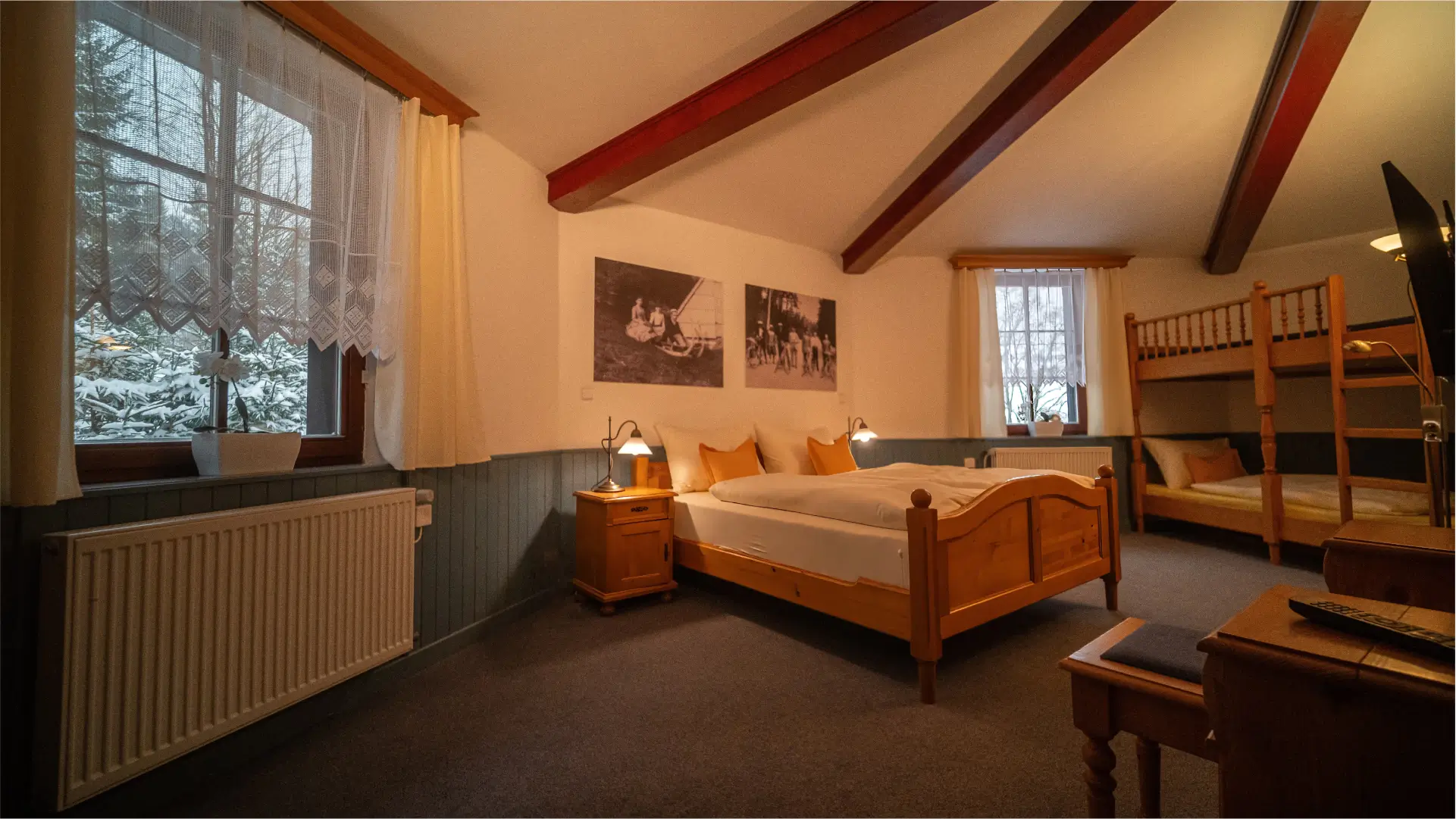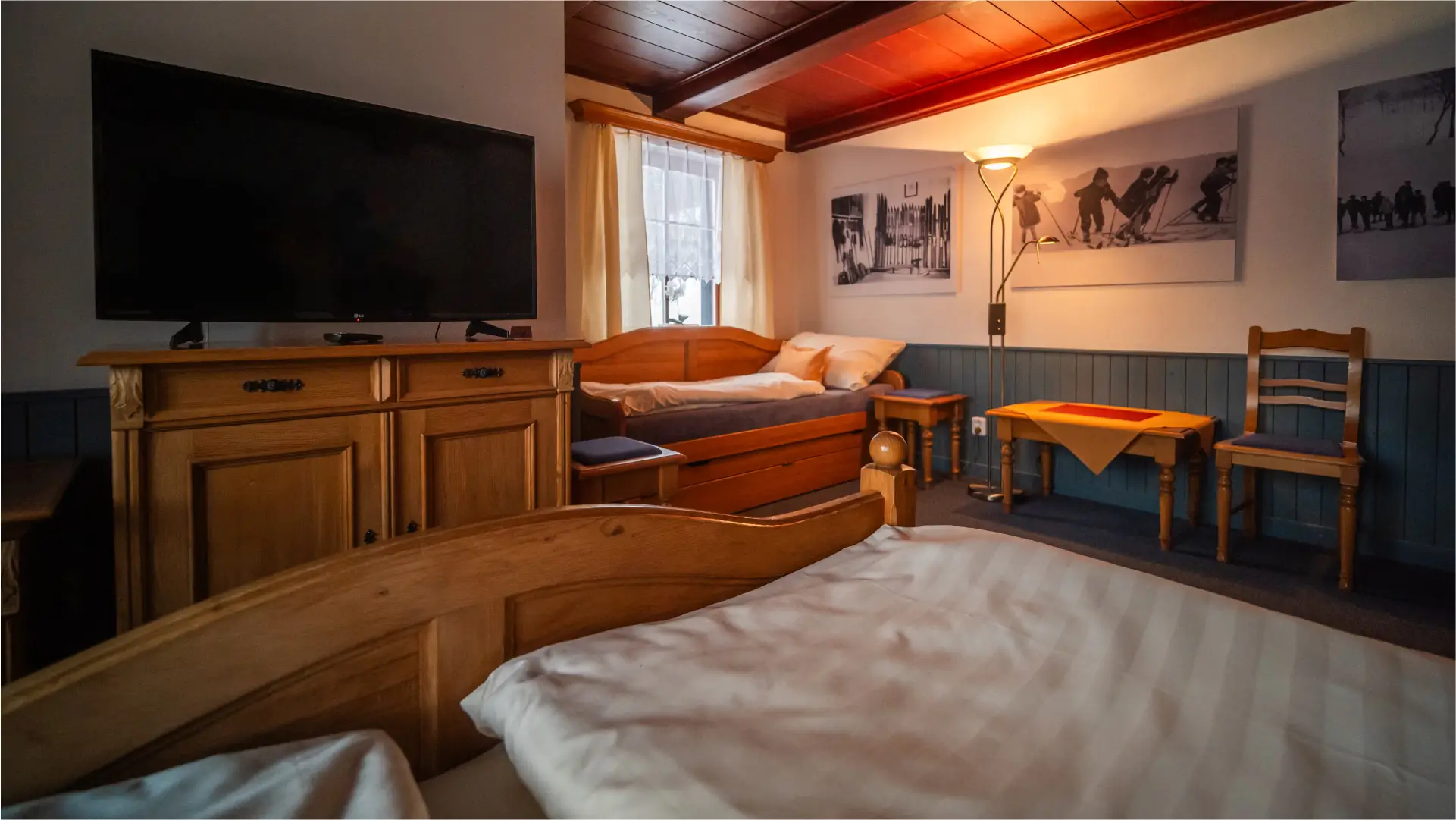 Pokoje jsou vybaveny masivním dřevěným nábytkem a působí přesně tak, jak si horské ubytování představujete. V létě oceníte venkovní posezení, ohniště, gril a prostor pro děti, v zimě pak lyžárnu, sušárnu a možnost vyrazit prakticky rovnou na svah či turistické trasy.