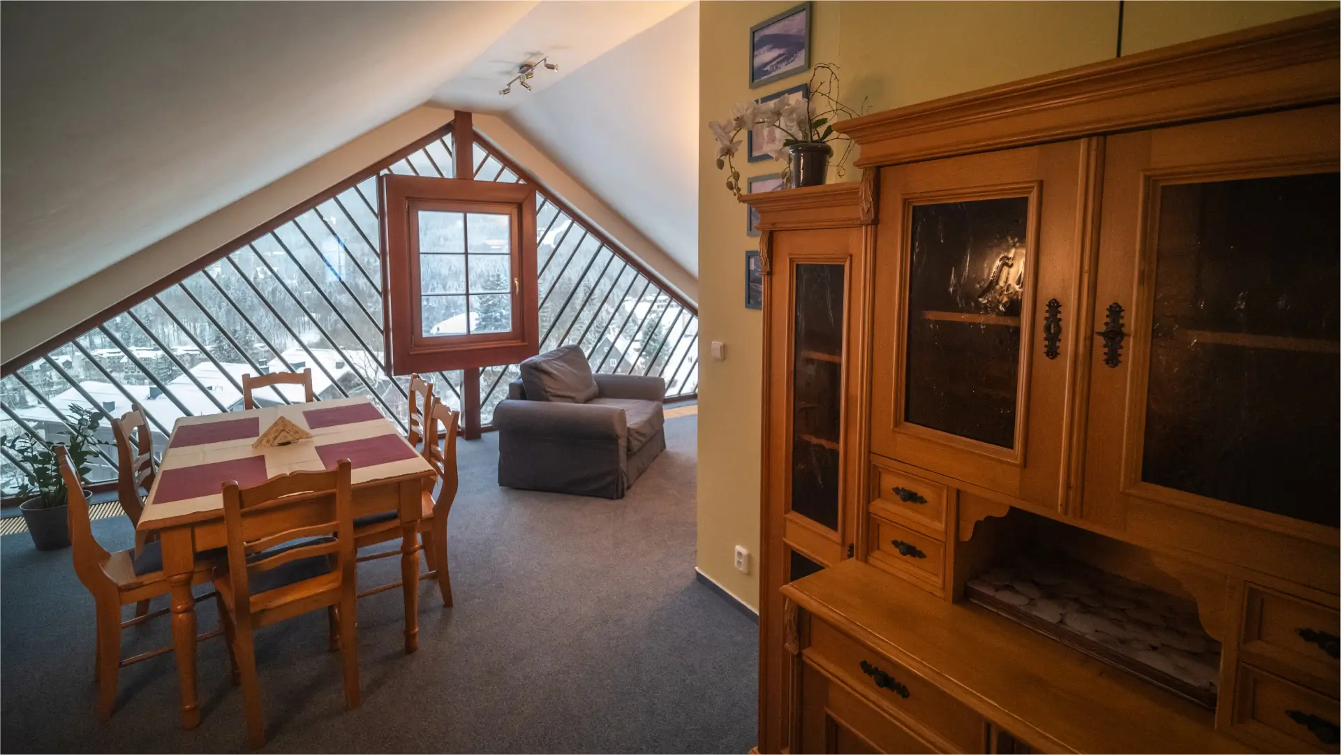 Pokoj s manželskou postelí, rohovou patrovou postelí, předsíňkou, kuchyňkou a koupelnou s toaletou. Toto rodinné studio je ideální pro čtyřčlennou rodinu. Nabízí 40 m² prostoru, manželskou postel, prostornou patrovou postel, kuchyňku s jídelním stolem, TV a koupelnu se sociálním zařízením. Nádherné výhledy zajištěny :). Můžete využít společné vnitřní i vnější prostory nebo vyhřátou saunu.